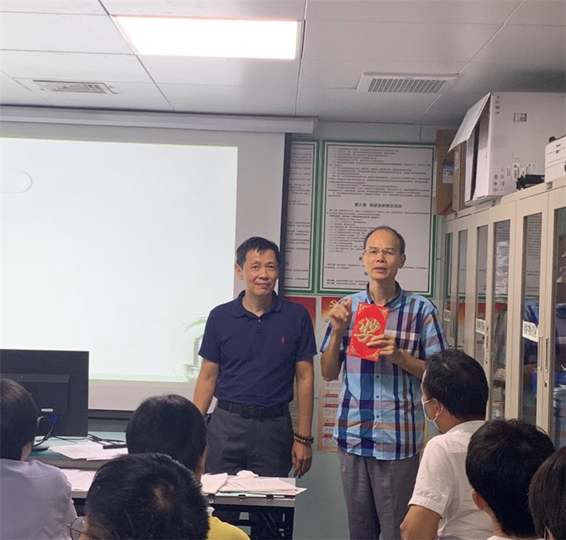 林主任指出,上学期教研室在承担了448个课时教学任务的同时,保证零教学事故;在疫情期间,老师们立即转换教学途径,纷纷变身“直播网红”,不让学生因为疫情耽误任何一节课。这些老师们的责任心与辛勤付出,值得我们赞扬与学习。接着,林主任提出,教研室正在制定教学流程、个人职责以及教研室奖励办法(试行),希望教研室工作更加规范化、科学化。最后林主任对杨利等四位老师顺利通过青年导师培养验收表示祝贺,对做出杰出贡献的免疫组卷组长梁劲松老师表示感谢并颁奖。希望各位老师再接再厉,在新学期中从教学成果、科研成果上大放异彩。