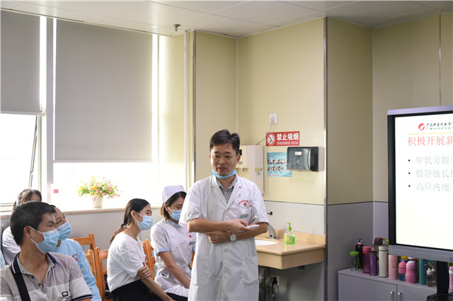 唐友明对肾病内科近年来取得的成绩给予了肯定,他表示,肾病内科是一个发展前景广阔的重点专科,虽然取得了一定的成绩,但也要正视科室存在中医药特色不足、学术氛围不够浓等问题。他对肾病内科今后的发展提出了六点要求:一是明确学科定位和方向,坚持中西医并重,发挥中医药在治疗肾病中的优势,把西医做精做强,中医做特做优;二是重视医疗质量和医疗安全,牢记并落实十九项核心制度,做好院感的重点监控;三是重视人才发展,鼓励骨干医师学习进修,补足短板;四是强化宣传,树立科室特色品牌;五是全面实施医疗教学科研一体化管理;六是团结协作,肾病内科和血透室齐头并进,互帮互助,打造一流学科和团队。