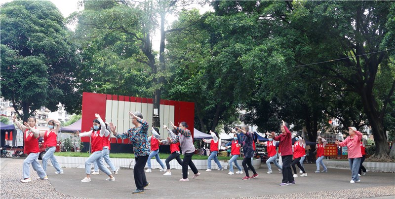 志愿者与社区居民一起打太极