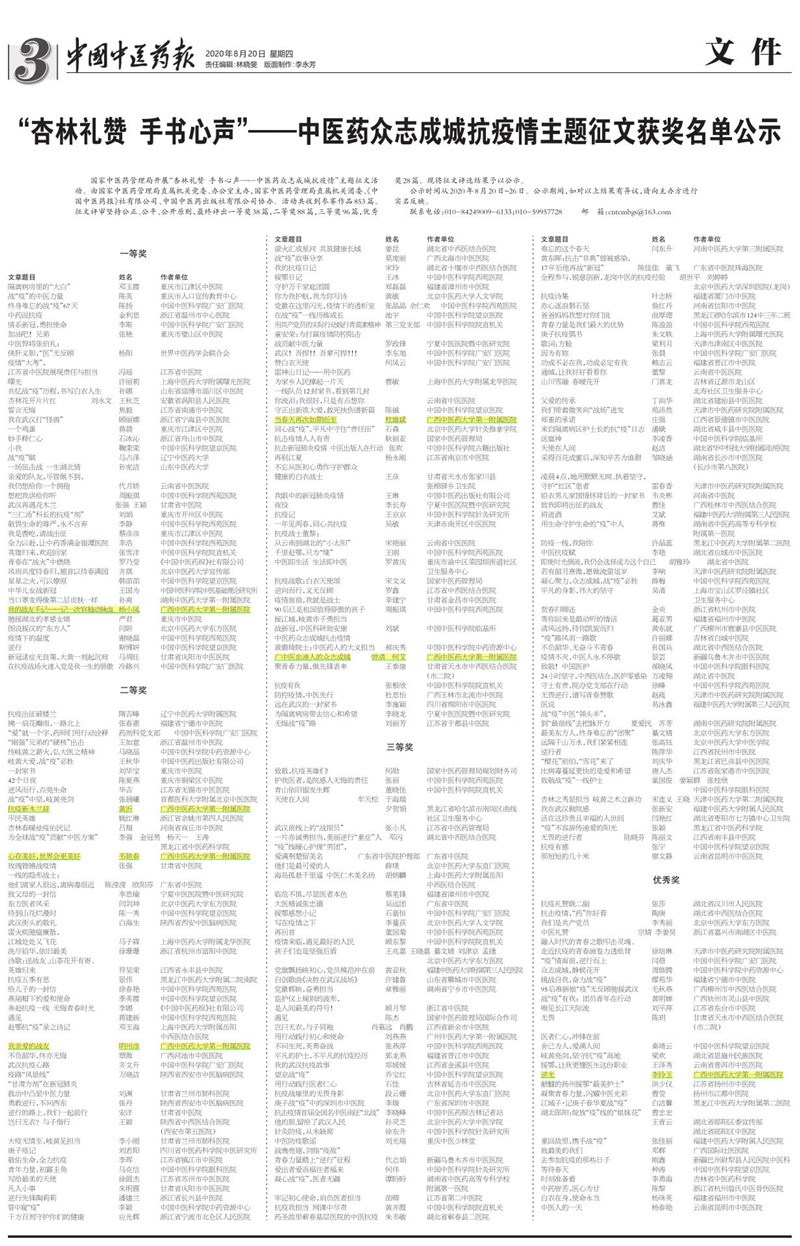 喜报!一附院多篇征文荣获国家中医药管理局“杏林礼赞 手书心声”--- 中医药众志成城抗疫情主题征文奖