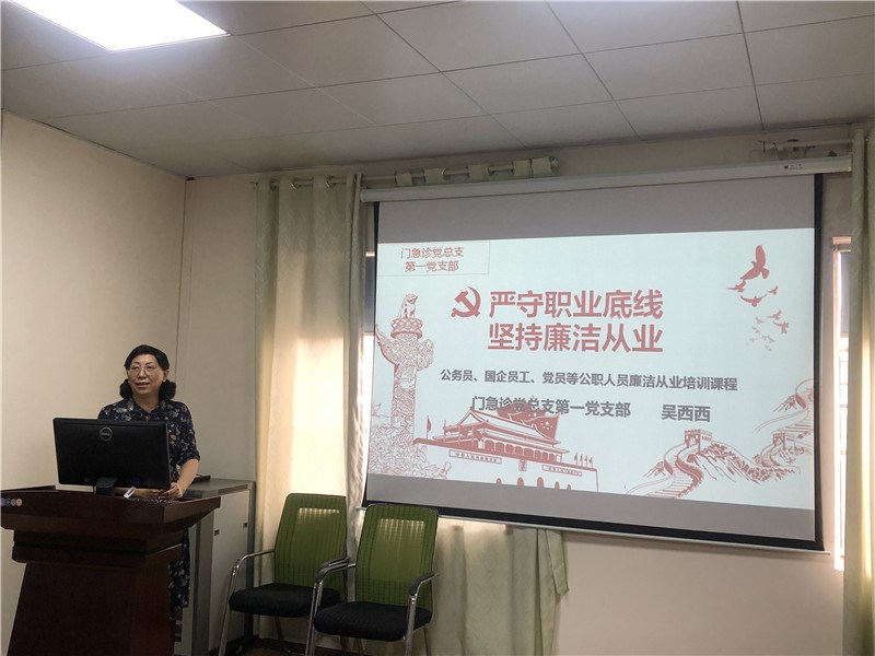 为了认真开展党支部“三会一课”活动,11月4日,一附院门急诊党总支第一党支部在医院门诊楼治未病中心会议室召开了党员大会,一附院副院长吴西西以普通党员身份参加了支部组织生活,并为党员同志上了题为“严守职业底线 坚持廉洁从业”的党课。