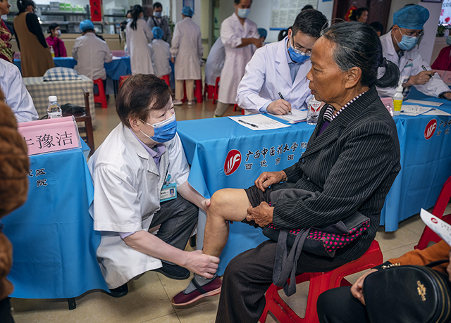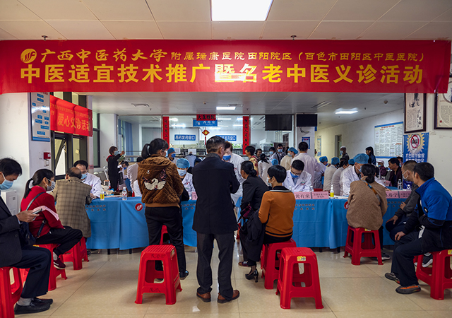 11月6日,附属瑞康医院“2020年广西名老中医工作站项目”走进田阳院区开展义诊及中医适宜技术推广培训班活动。此次义诊专家团队由脾胃病科、中医内科、乳腺病科、神经内科、骨伤科、妇科、针灸科、正骨推拿科等科室12名专家组成。同时,田阳院区也派出骨干医师协助义诊工作。