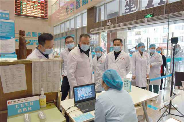 董柏青一行先后到发热门诊、出入口测温点、CT室、急诊中心、核酸检测采集点了解预检分诊流程、发热病人转运流程等一系列疫情防控措施,并与一线工作人员深入交流。随后,其一行还参观了国医大师馆、治未病中心、国医堂等科室。
