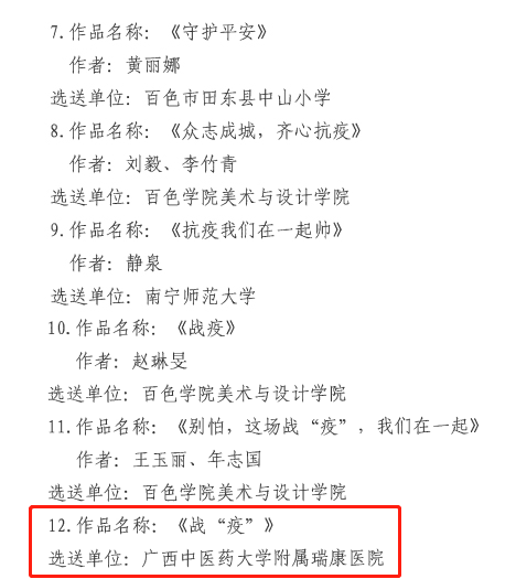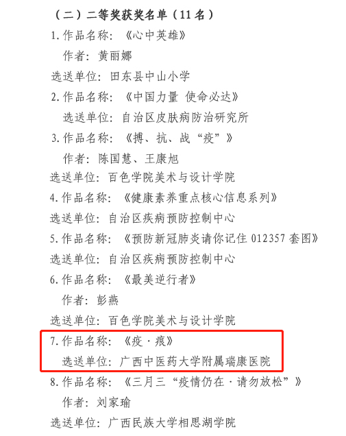 此次活动全区各地各部门都高度重视和积极响应,共收到卫生健康机构、文化部门、学校、社会各界报送的文学类作品464件、视频类作品265件、音频类作品137件、绘(漫)画类作品251件、平面设计类作品217件。经过由各相关专业领域的专家组成专家组进行评审,最终附属瑞康医院选送作品《疫·痕》获平面设计类二等奖,《驰援人员》《战“疫”》获平面设计类三等奖。