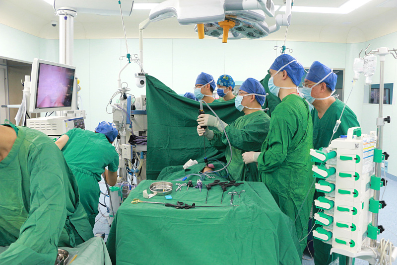 经过一系列的术前准备,5月7日上午9点,桃子进入手术室,准备接受胸腔镜探查及纵隔肿瘤切除手术。手术由黄金狮主刀,广西国际壮医医院小儿外科医师秦伟任第一手术助手。这也是广西首例接受小儿腔镜下纵隔肿瘤切除术的患儿。