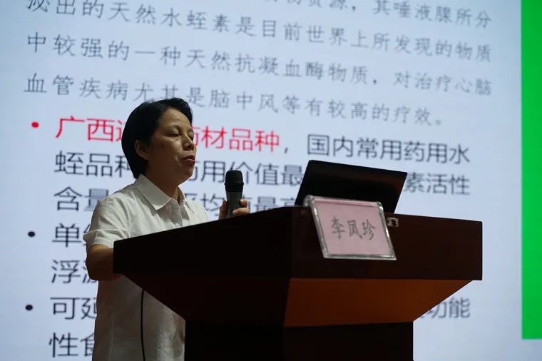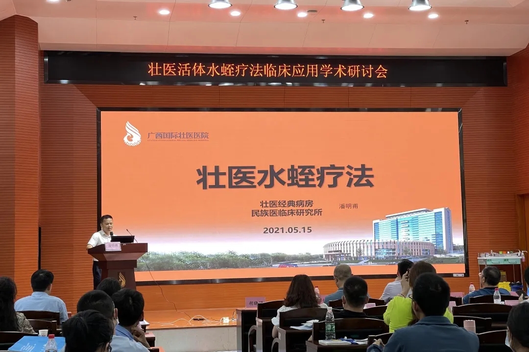 研讨会上,壮医经典病房主任潘明甫,向各地同仁重点介绍了壮医水蛭疗法的科研探索、壮医水蛭疗法临床应用情况。