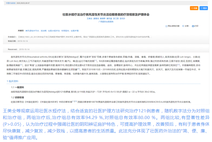 2008年以来,广西壮医医院(广西国际壮医医院明秀分院前身)对壮医水蛭疗法开展了深入挖掘和系统总结,进一步针对类风湿关节炎、痛风、臁疮、中风后遗症等优势病种的临床特征和病理表现,进行了大量临床探索和技术优化。