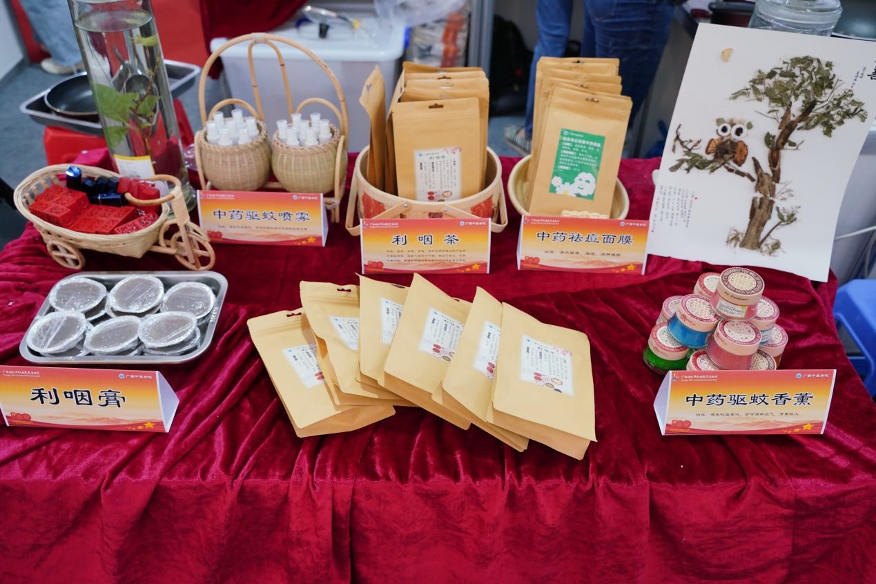 学校自主研制的中医药特色产品:利咽茶、利咽膏、中药驱蚊喷雾、中药驱蚊香薰等