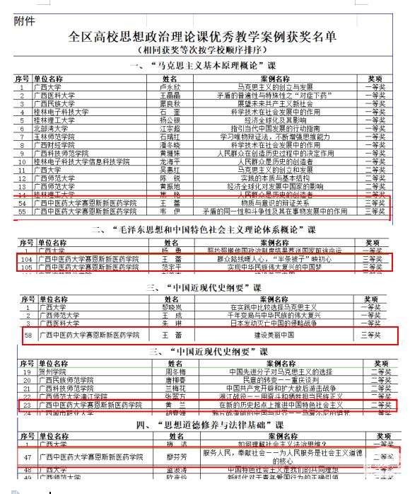 日前,自治区教育厅公布了全区高校思想政治理论课优秀教学案例名单,赛院共获2个二等奖,5个三等奖。其中,黄兰老师的《在新的历史起点上推进中国特色社会主义》荣获“中国近现代史纲要”课二等奖;廖芬芳老师的《服务人民,奉献社会——为人民服务是社会主义道德的核心》荣获“思想道德修养与法律基础”课二等奖;王蕾老师的《物质与意识的辩证关系》荣获“马克思主义基本原理概论”课三等奖,《群众路线暖人心,“半条被子”映初心》荣获“毛泽东思想和中国特色社会主义理论体系概论”课三等奖,《建设美丽中国》荣获“中国近现代史纲要”课三等奖;韦伊老师的《矛盾的同一性和斗争性及其在事物发展中的作用》荣获“马克思主义基本原理概论”课三等奖;范宇平老师的《实现中华民族伟大复兴的中国梦》荣获“毛泽东思想和中国特色社会主义理论体系概论”课三等奖。