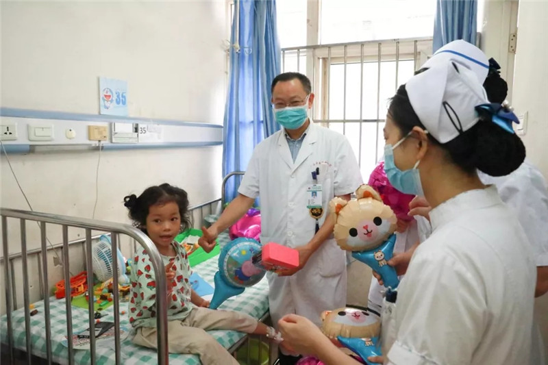 在仙葫院区儿科,伴着和煦的阳光,儿科副主任覃耀真、王广青带领儿科医护人员为孩子们送上节日礼物和祝福,打造一个专属于他们的“六·一”儿童节。