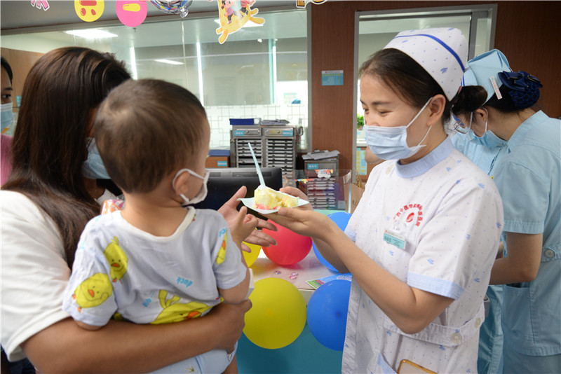 下午三点,双层蛋糕来到了护士站,孩子们纷纷从病房里出来。等待切蛋糕的同时,护士长对收来的画作进行了评选,为小朋友们颁发奖励,每一位参赛的小朋友都收到了心仪的小礼物,画得最好的小朋友还获得了一枚国旗贴纸。最后每一位小朋友、大朋友都分享了香甜的蛋糕,活动现场一片欢声笑语。看着高兴的孩子们,医护人员们也十分欣慰:“做的一切都值了,祝福这些坚强的小精灵早日康复,健康成长!”
