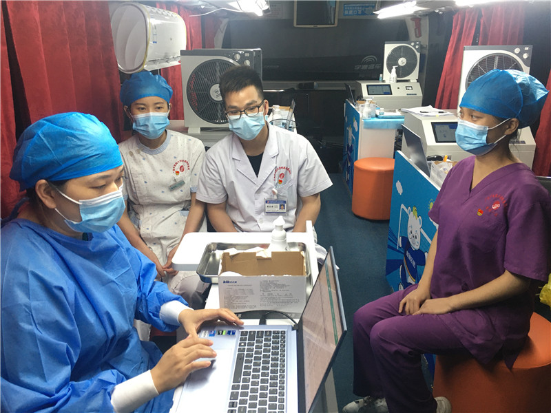 在接种现场,移动接种车是由普通大型客车改造而成,车厢内配有电脑、扫码枪、身份证读卡器、打印机、太阳能冰箱、接种台智能冰箱、医用空气消毒机、空调、WIFI等设施,共设4个接种台,单日最大接种能力可达2000剂次。但由于车内空调需要车辆发动机启动才能开启,而实际操作中又发现车辆启动时往往会干扰接种平台运行,这样接种工作时就难有空调保障。一方面,队员们需要熟练掌握疫苗的接种技术,详细了解各类疫苗的作用、禁忌症、不良反应处理及相关政策知识等,并还需保持清醒的头脑专注工作,确保万无一失。另一方面,在当下高温酷暑情形下,队员们还身穿严实的隔离服,且又挤在狭窄车厢内连续数小时工作,所经受闷热与劳累的煎熬可想而知。但即使面对再多苦难,自从接种队来到崇左后,队员们每天都是从清晨到深夜满负荷工作,没有丝毫怨言。“作为医护人员,我们必须做抗疫的急先锋,为早日建立起全民免疫屏障,再苦再累都值得。”杨丹丹说。