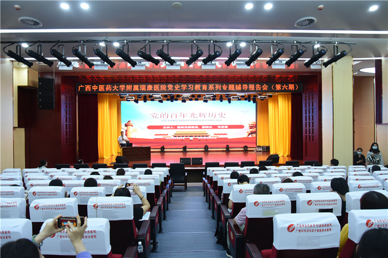 为庆祝中国共产党成立100周年,深入学习贯彻习近平总书记在党史学习教育动员大会上的重要讲话精神,教育引导广大党员干部职工做到学史明理、学史增信、学史崇德、学史力行,根据医院开展党史学习教育部署安排,附属瑞康医院于6月10日下午在10楼报告厅举行党史学习教育系列专题辅导报告会(第六期)暨红色经典电影展播活动,医院党委委员、副院长韦思尊以《党的百年光辉历史》为题为到场的各支部党员、入党积极分子、学生党员代表们上了一堂生动的党史学习教育专题党课。