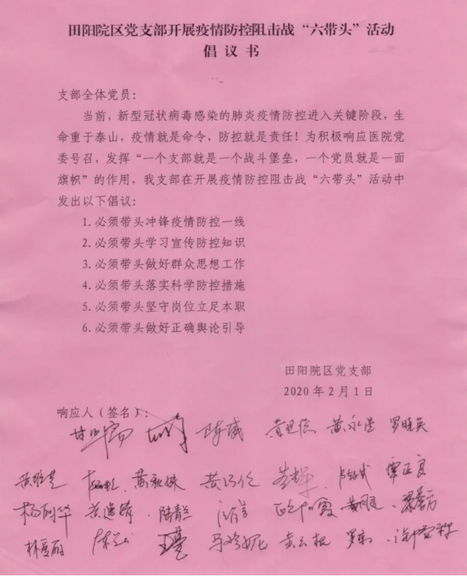 ▲田阳院区党支部疫情期间“六带头”倡议书