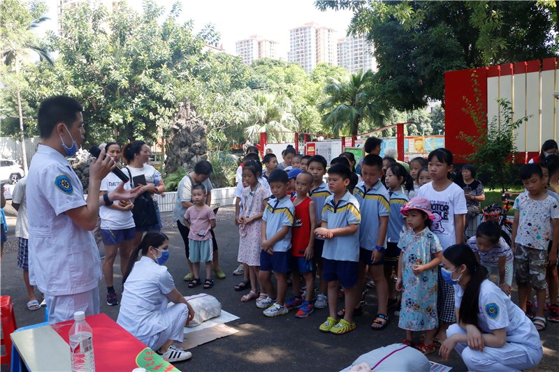 为增进社区家庭亲子关系,推动儿童心理健康成长,提升社区居民急救技能水平, 7月14日,一附院团委、社工部在南宁市万力社区开展“情暖童心,青春护苗”暑期社会实践活动,共计28名志愿者参与本次活动,并邀请到一附院东葛院区重症医学科、脑病二区、呼吸与危重症医学科、仙葫院区重症医学科、急诊科的青号成员为社区居民提供义诊及健康咨询,为志愿者提供急救技能的专业指导与示范。