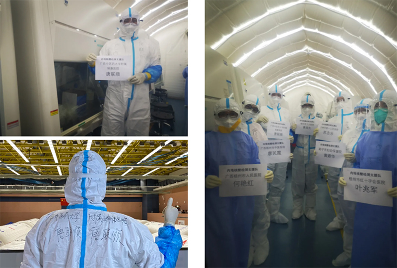 作为一名离病毒最近的人,一名共产党员,这种时刻,行动是最好的证明。当听说广西有志愿队名额时,他第一时间交上自愿报名表,凭借平日工作的优异表现,于2020年8月被组织选入内地核酸检测支援队。“从大年三十到清明放假,从初一值班到五一假期坚守,忙碌的检测贯穿着整个2020年上半年,本来以为天气转暖疫情会暂缓,可这个疫魔比我们想象的顽强,但无论如何都要坚守人民健康的大门”唐联顺说。