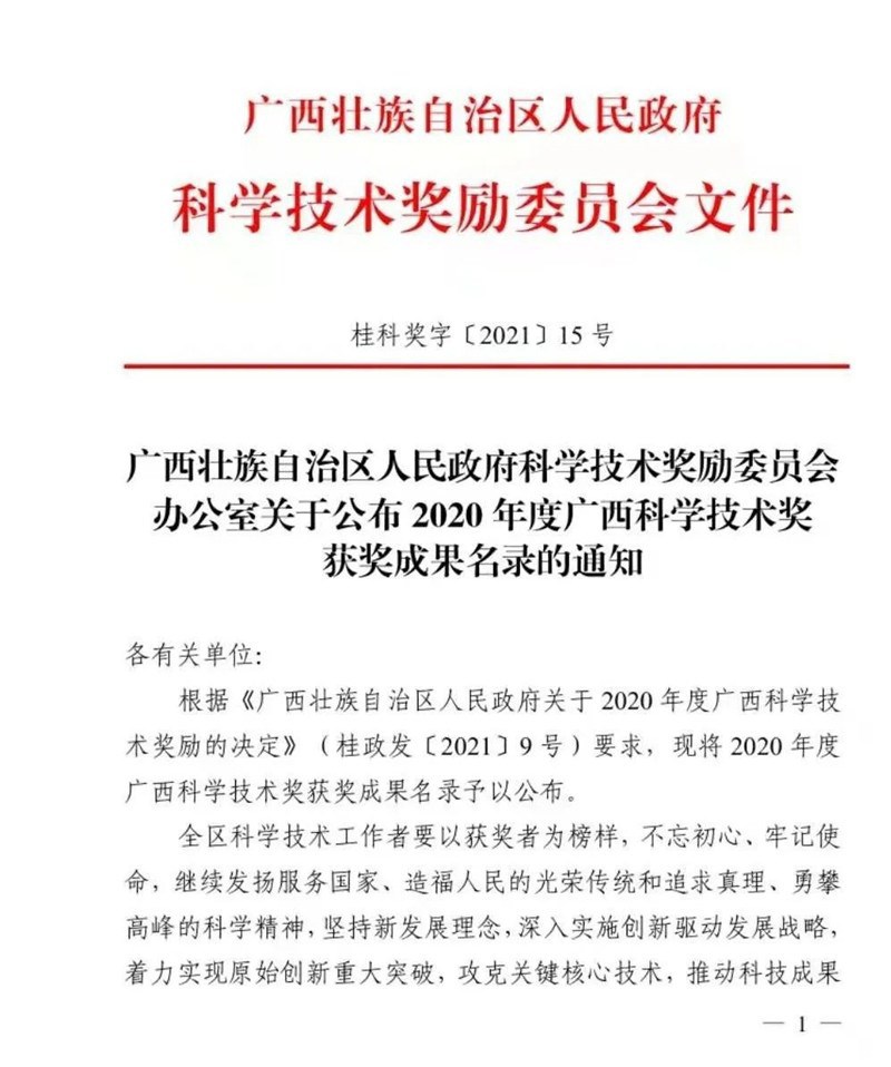 广西科学技术奖是广西科技界的最高奖项,每年奖励的是对广西科学技术进步、经济社会发展作出突出贡献的科技人员和组织。此次获奖是我院在省部级科技奖励方面的又一重大突破。