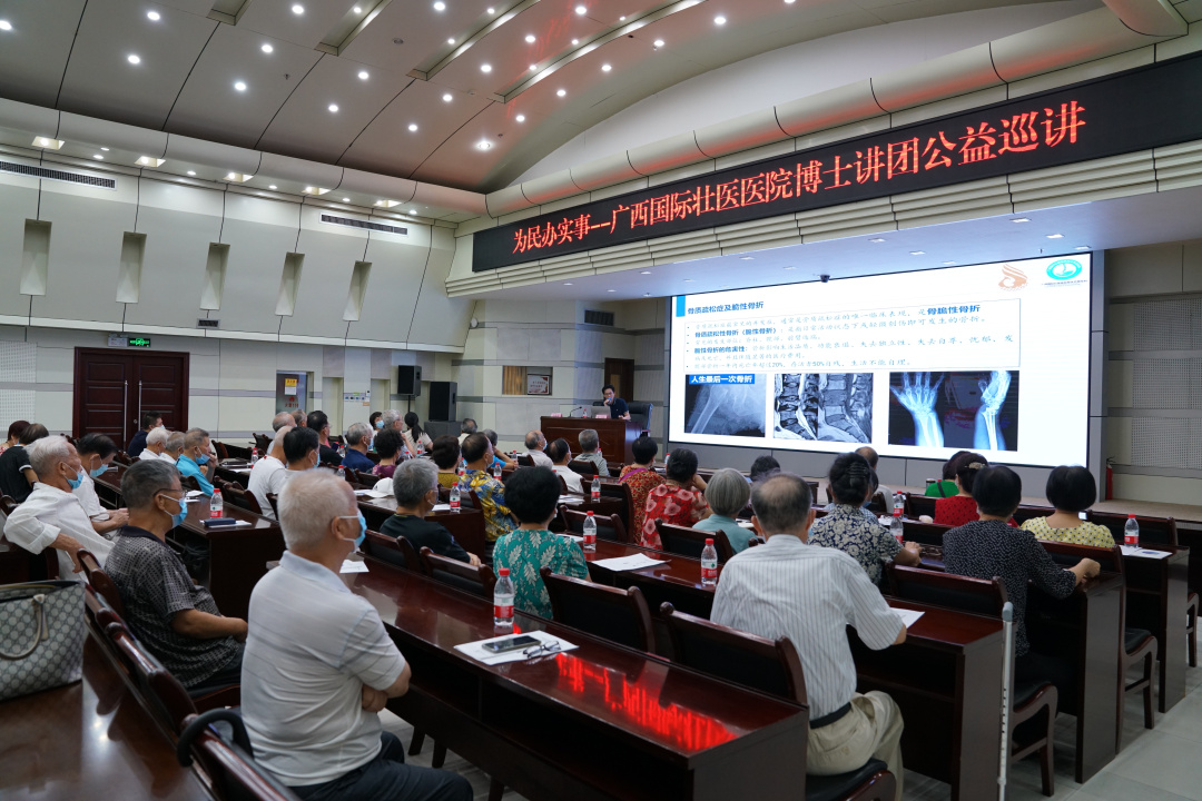 8月25日下午,第四场“为民办实事——广西国际壮医医院博士讲团公益巡讲活动”走进广西壮族自治区住房和城乡建设厅,国壮骨关节与脊柱科主任张文捷博士以《骨质疏松症认识与治疗》为题授课,为60余位住建厅离退休干部职工讲解骨质疏松的形成原因,科普防治方法,并在课后与科室成员开展现场义诊、特色疗法体验等服务。