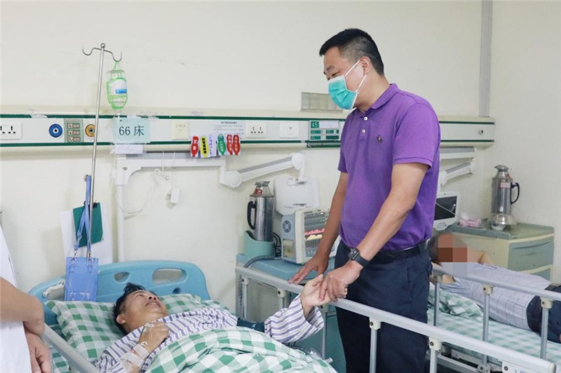 在得知韦建才体检发现问题的消息后,一附院党委书记桂雄斌就一直牵挂着这位同志的身体情况,韦建才手术后第二天,桂雄斌即来到病房,看望正在术后休养的韦建才,送去慰问品,鼓励其坚定信心,战胜疾病,早日康复。同时,桂雄斌和主刀医师李峰详细了解了韦建才的病情、治疗情况,嘱托科室必须要做好后期治疗及护理工作。