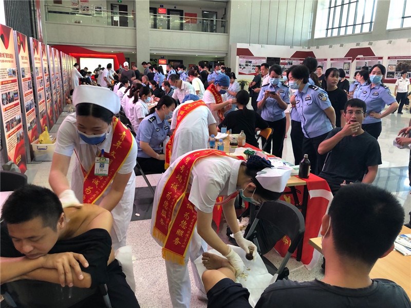 当天上午,义诊活动准时在9点00开始。活动按照疫情防控要求,由现场工作人员协调有序咨询诊疗。现场以一对一的形式为民警和辅警检查身体状况并提供义务诊疗,各科医生通过望闻问切等方式,分析诊断警务人员身体状况,并针对一线警务人员长期熬夜“连轴转”造成的“职业病”,从各自专业角度进行细致讲解以及给予有针对性的治疗建议与体验。本次仁爱分院出来带来基本的咨询诊病外,还有现场测血压测血糖、耳穴压、豆豌踝针、中药擦涂等众多中医药特色体检项目。