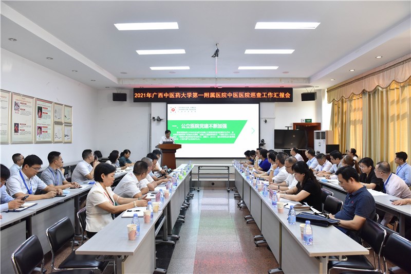 9月29日,巡查反馈会在一附院医技楼7楼第二会议厅召开。自治区中医药局党组书记、局长黎甲文,医政处处长潘霜,全体巡查专家组成员,一附院在院领导和相关科室负责人共40余人参加会议。