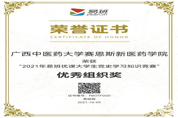 百年恰是风华正茂,奋斗报国砥砺前行。为进一步巩固党史学习教育成效,不断推进党史学习教育走深走实,教育部易班发展中心、易班网依托易班优课平台和“学习强国”上海学习平台,举办了为期一个月的“2021年易班优课大学生党史学习知识竞赛”。赛院党委高度重视,由学工处积极组织和发动学生参加竞赛活动,取得了显著的成绩,荣获“2021年易班优课大学生党史学习知识竞赛”优秀组织奖。