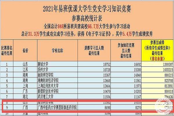 活动中,赛院进群学习共8698人,参加知识竞赛8270人,参赛总成绩为670077分,获得满分学生有784人,参赛总成绩在广西区内排名第一、全国易班共建高校中排名第九。
