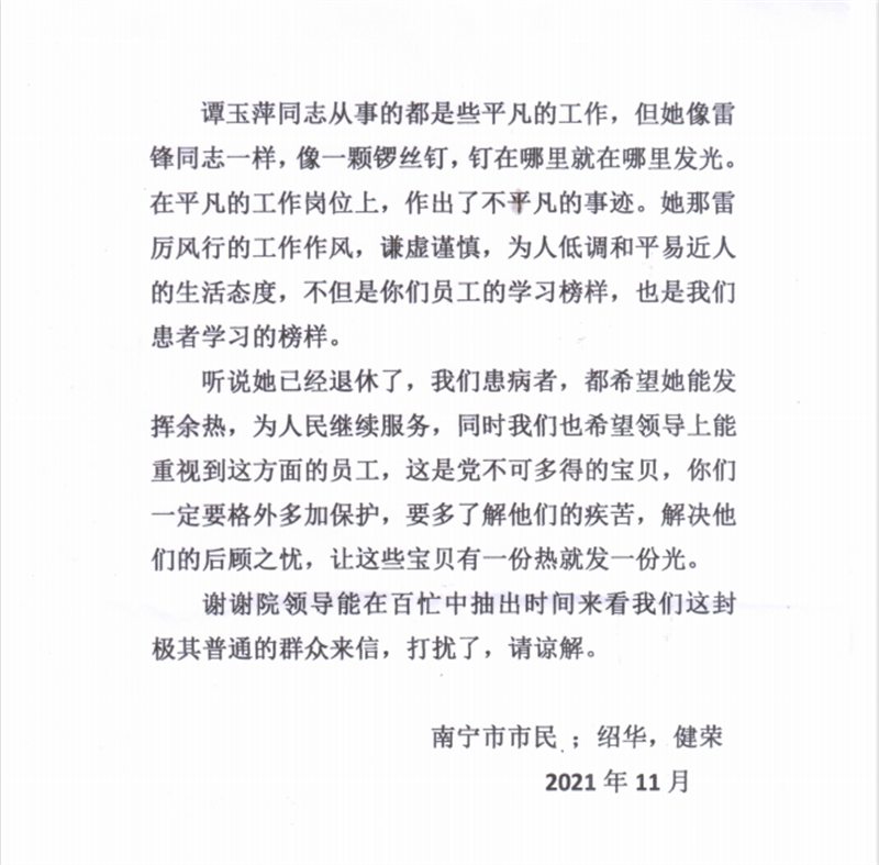 患者的满意是我们最大的追求,感谢信中一句句朴实的话语,不仅让医务人员感到温暖,也传递了医患关系的正能量。这不仅仅是一幅牌匾、一面锦旗、一纸书信,更多的是一份信任,一份认可,医院将以更精湛的医术、高尚的医德继续前行,让每一位患者感受到家一样的温暖。