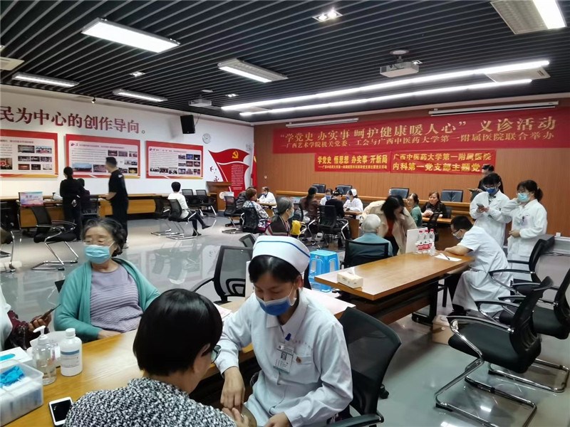 一附院于11月5日上午与下午,由外联拓展部组织东葛院区心血管二区、乳腺外科、美肤科、康复科、治未病中心、心胸外科、脾胃病科分成两批人员赴广西艺术学院工会与广西邮政总局为群众和职工进行义诊活动。