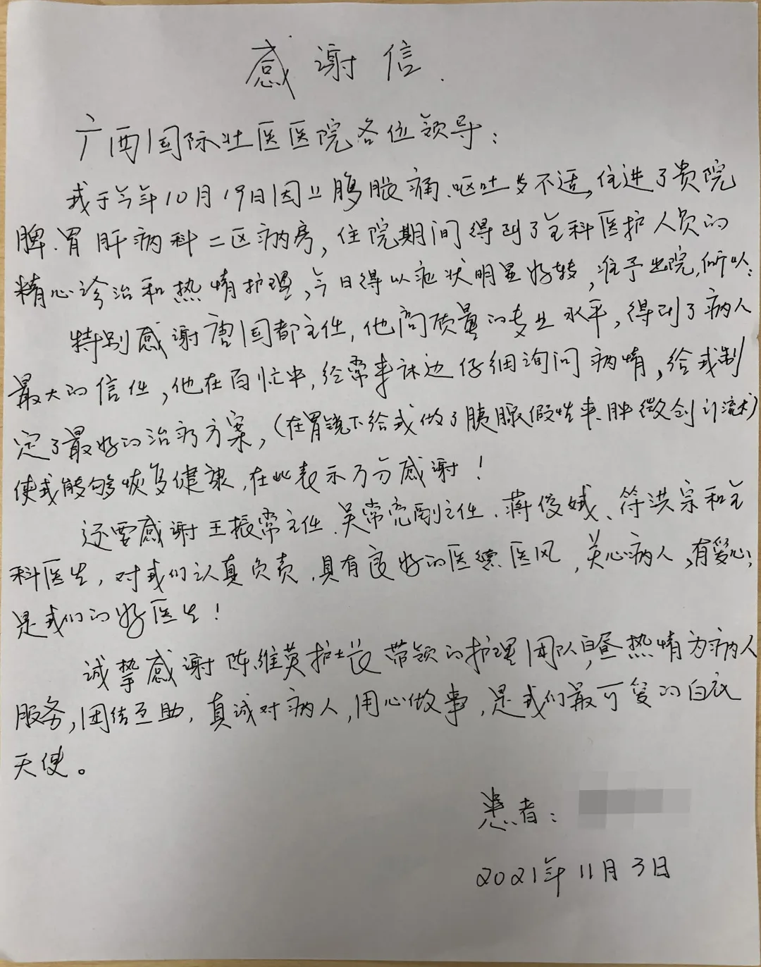 出院前,谭女士手写了一封感谢信,感谢唐国都“高质量的专业水平”让自己重拾健康,真诚感谢脾胃肝病科医护人员的悉心照顾,感谢“最可爱的白衣天使”助自己渡过难关。