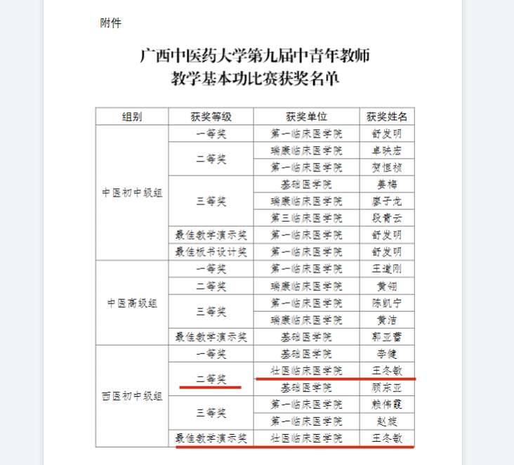 近日,YABO鸭脖公布第九届中青年教师教学基本功比赛获奖名单,壮医临床医学院青年教师、广西国际壮医医院小儿外科、护理学教研室王冬敏,以85.82分(满分100分)的成绩荣获西医初中级组二等奖,以54.31分(满分60分)的最高分喜摘西医初中级组最佳教学演示奖。