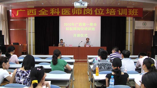 为期两个月的2010年度广西第一期全科医师岗位培训班于6月2日在广西城市社区卫生服务技术指导中心培训部开班,30多名来自全区各社区卫生服务机构的社区医师报名参加了培训。