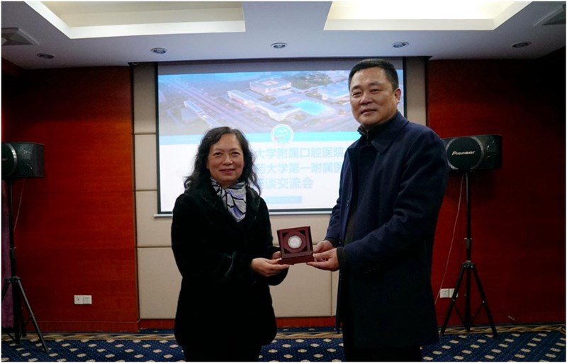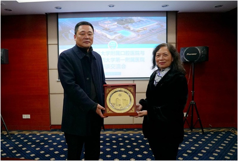 一附院党委书记桂雄斌向广西医科大学口腔医学院赠送纪念品