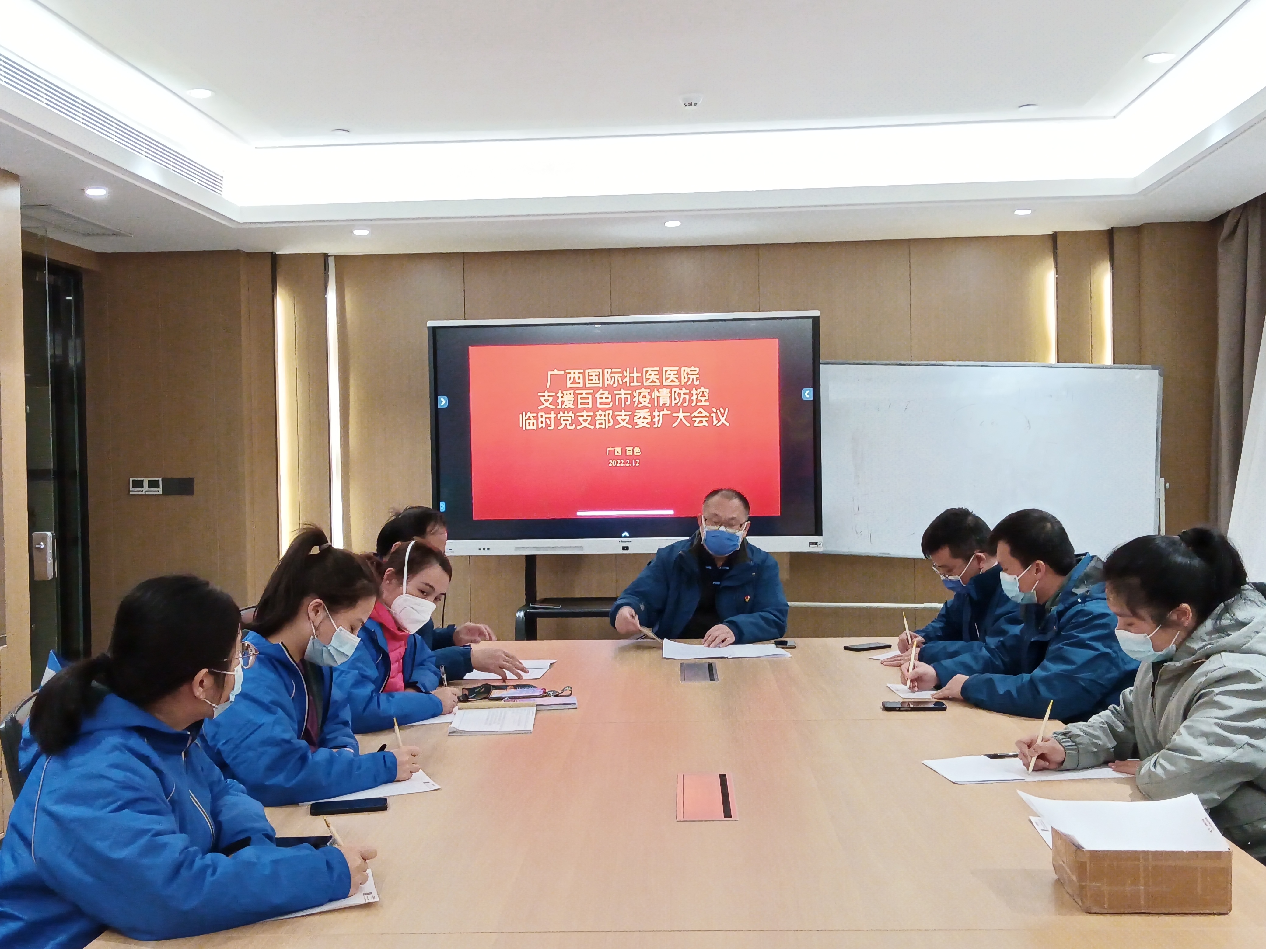 2月12日晚,在百色执行疫情防控任务的附属国际壮医医院支援百色市疫情防控临时党支部在驻地召开了临时党支部支委扩大会议,临时党支部支委及党小组组长参加。