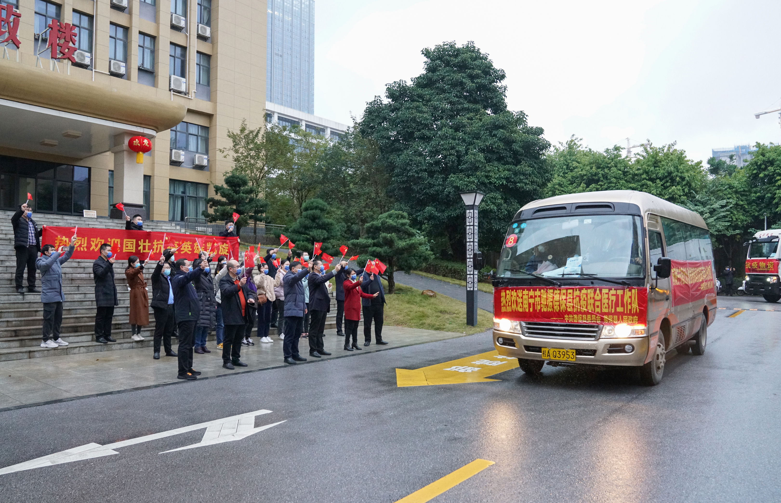 2月21日下午18时30分,附属国际壮医医院移动核酸检测车检测支援队平安返回,院党委书记秦祖杰、院长岳桂华及其他在家领导班子成员、干部职工,手执旗帜在行政楼前热烈欢迎,感谢抗疫英雄出色完成支援任务,向党和人民交出一份满意的答卷,为德保县疫情防控取得阶段性胜利,贡献国壮力量、展现国壮人昂扬向上精神风貌。