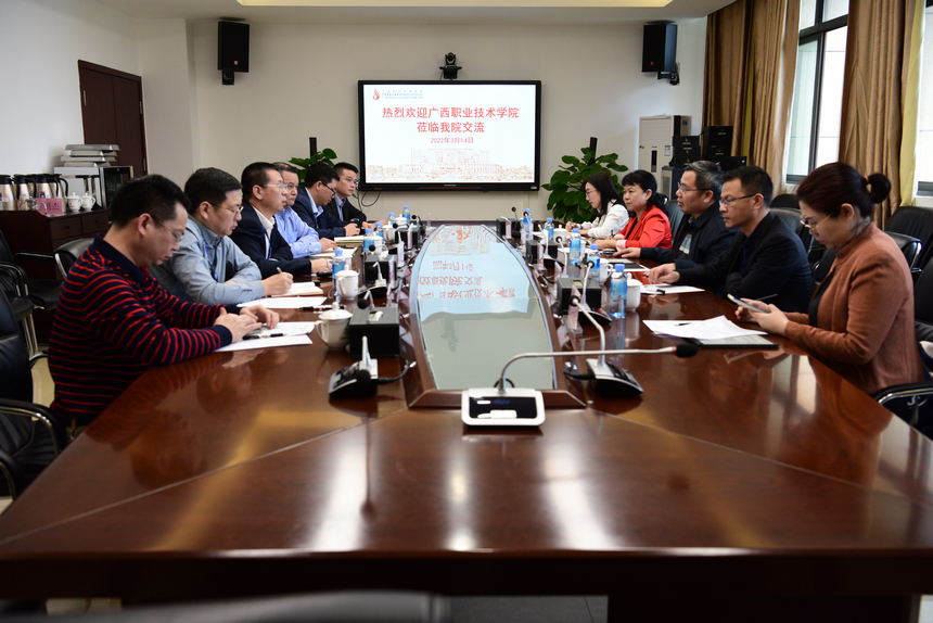 广西职业技术学院到附属国际壮医医院参观交流 来源:附属国际壮医医院 作者:宣传科 日期:2022-03-14 点击数: 次 分享到: 3月14日下午,广西职业技术学院院长梁裕一行到我院考察交流。医院院长岳桂华,副院长黄国东、唐盛军出席座谈会。双方就构建大健康养生、人才培养、队伍建设、教学实习等院校合作项目展开讨论。会后,梁裕一行还到我院治未病中心、健康管理中心、门诊大厅等处进行了实地考察。相关职能部门陪同考察。 打印正文 关闭本页
