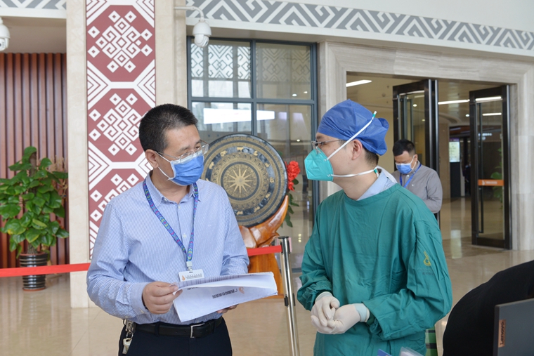 3月21日上午,附属国际壮医医院院长岳桂华再次率队深入医院各重点防控区域开展督导检查,并进行现场办公。他强调,全院上下务必从严、从实、从细做好疫情防控工作,确保各项政策措施落实到位,确保不会发生院内感染事件,确保维护正常的医疗秩序。副院长黄国东、唐盛军及相关职能部门人员参加。