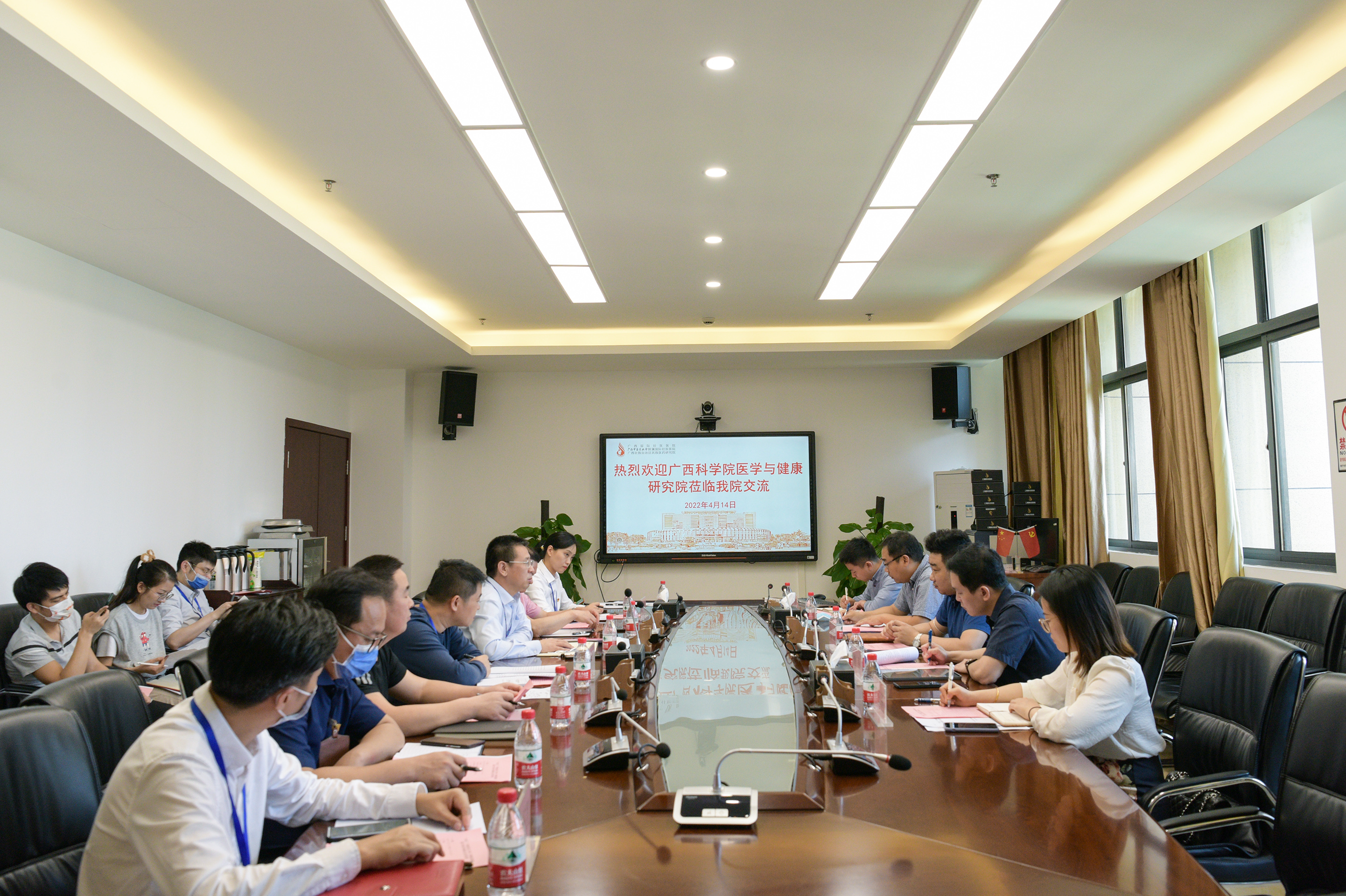 广西科学院医学与健康研究院院长季风到附属国际壮医医院座谈交流 作者:陆文 日期:2022-04-15 点击数: 次 分享到: 4月14日上午,广西科学院医学与健康研究院院长季风一行到附属国际壮医医院座谈交流,双方就科研、平台构建、人才培养等方面合作进行深入探讨。院长岳桂华,副院长黄国东出席座谈会。会后,黄国东陪同考察壮瑶医药研究实验室。座谈会现场 打印正文 关闭本页