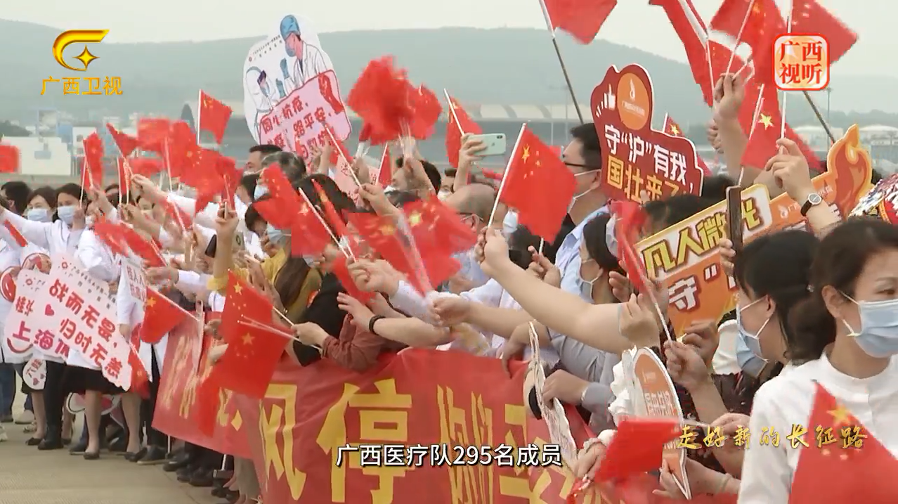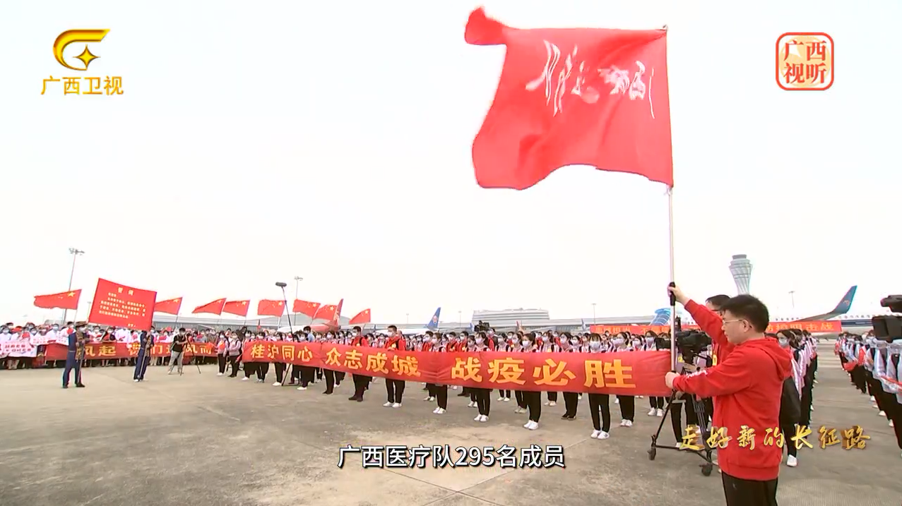 专题片的第五集《走好新的长征路》中广西国际壮医医院欢送援沪医疗队出发画面。