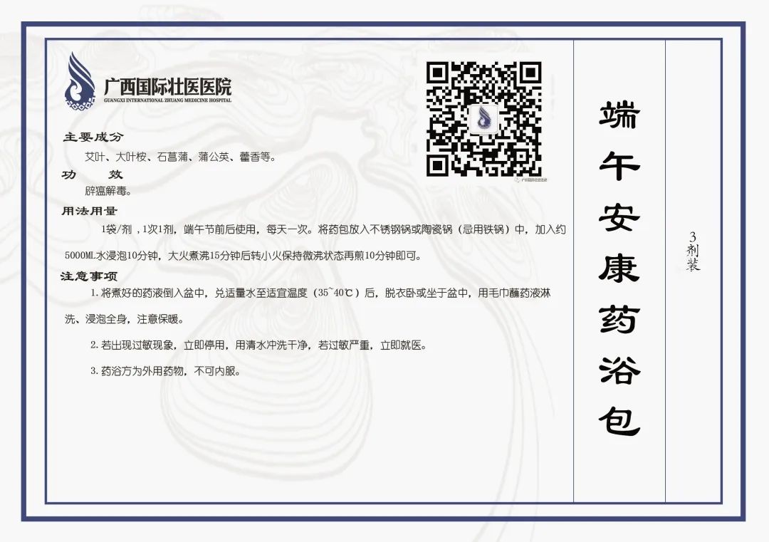 广西国际壮医医院特推出端午安康药浴包,一包含三小包,每小包可用一次。内含艾叶、大叶桉、石菖蒲、蒲公英等药材,可辟瘟解毒。(可用医保)