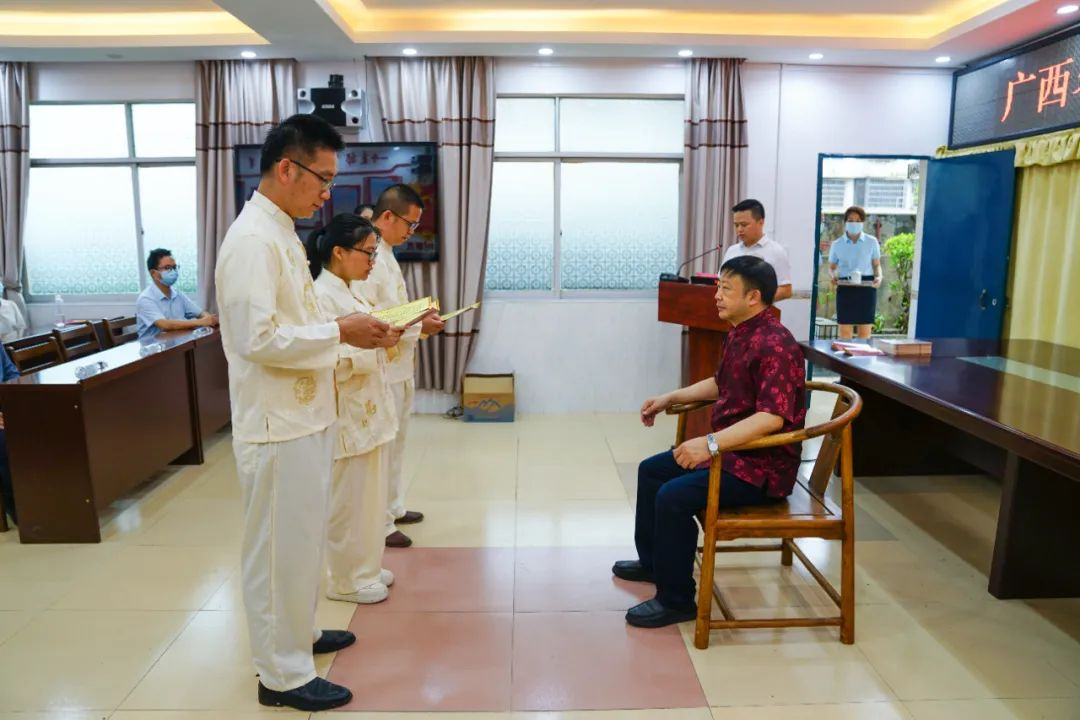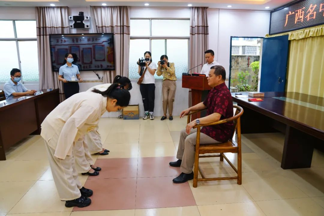 拜师仪式现场,弟子身着拜师服诵读拜师誓词、呈拜师帖、奉茶、鞠躬,导师一一赠回徒贴。当天上午,共有6名武宣县中医院医师分别拜入秦祖杰、黄国东门下,跟师学习名医学术思想及经验。