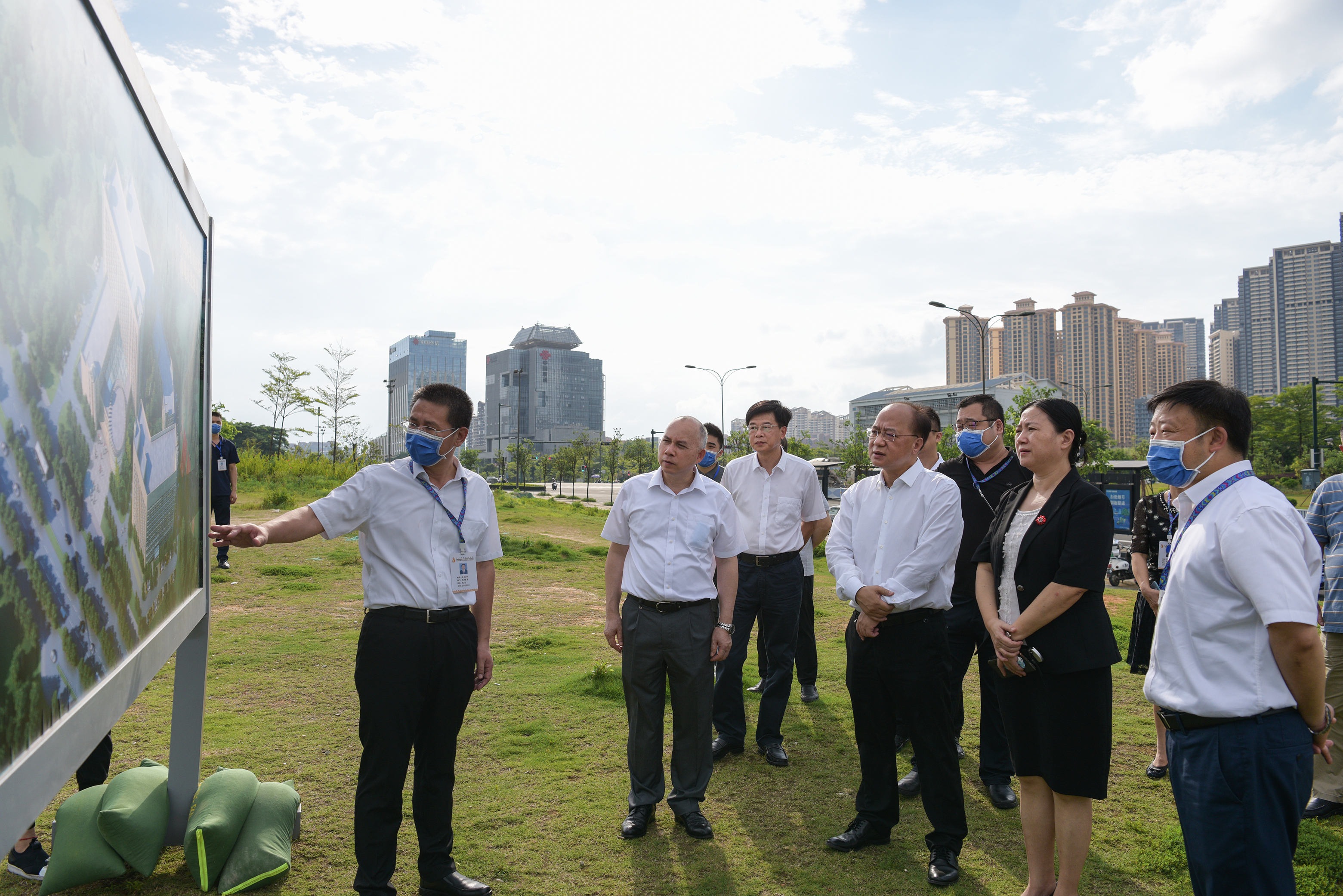 廖品琥(右二)、黎甲文(右四)在姚春(右三)的陪同下听取工作汇报