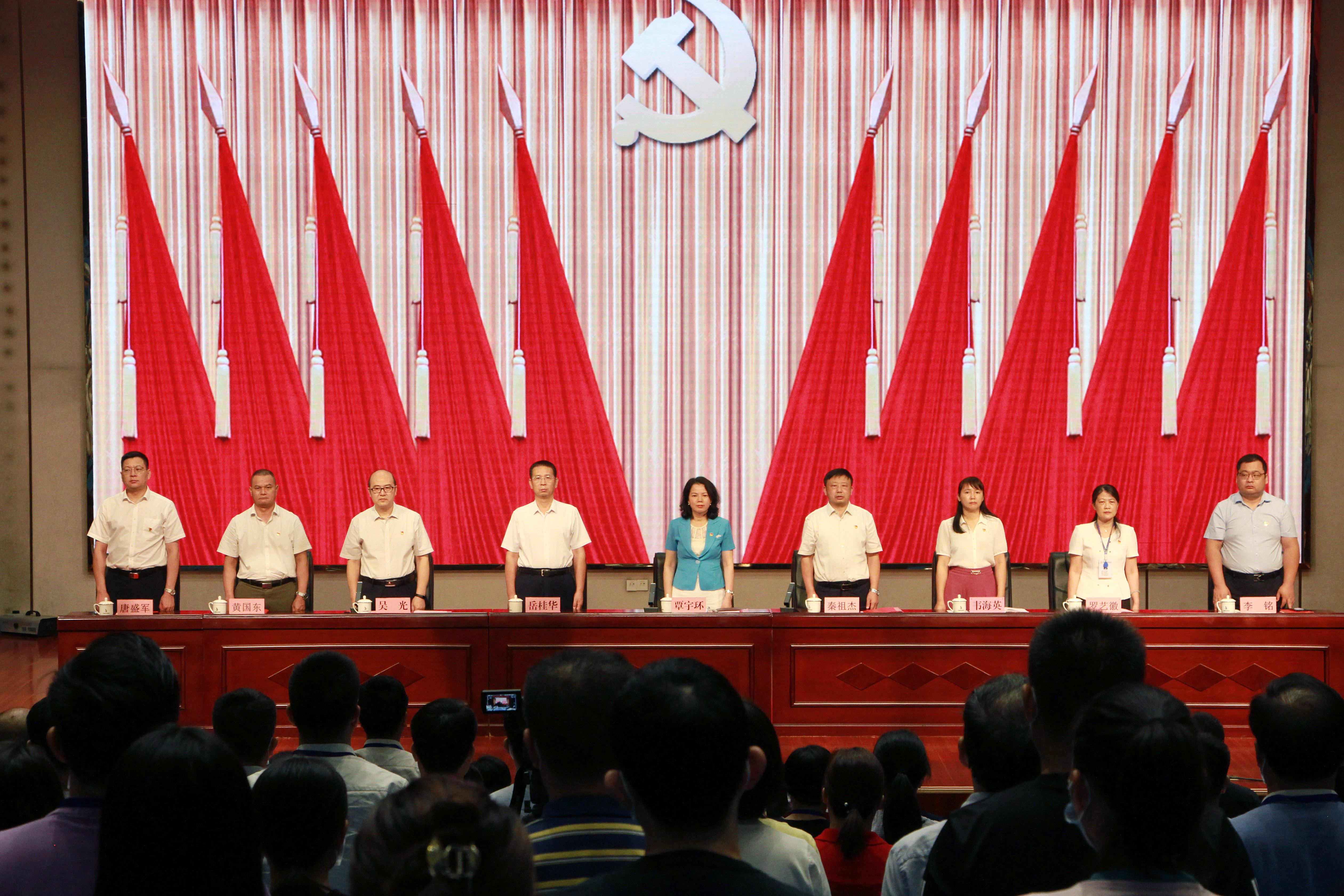 大会在雄壮的国歌声中拉开帷幕,全体党员起立,奏唱国歌