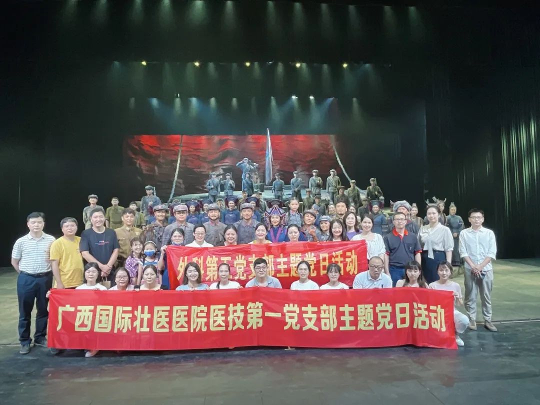 8 月18日,医技第一党支部联合外科第五党支部组织赴南宁剧场,以观看革命历史题材红色音乐剧《血色湘江》的形式开展红色传奇党史学习教育,共同重温共产党人的峥嵘岁月。
