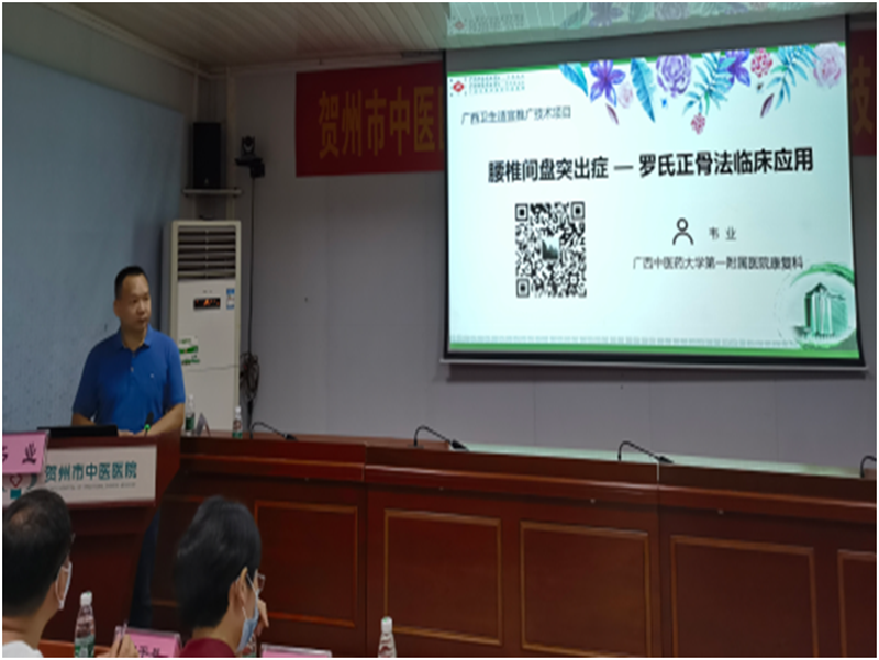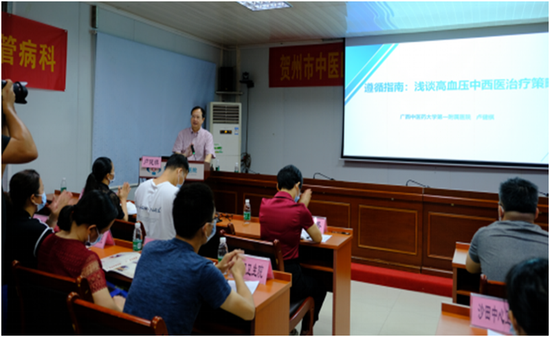25日上午,专家团队在贺州市中医医院会议室举办中医诊疗方案推广及学术讲座活动。卢健棋教授以“遵循指南浅谈高血压的中西医治疗策略”为题,提出了有效提高高血压治疗率和控制率的中西医结合治疗方案;谭炜副主任医师进行了《广西中医心力衰竭及高血压诊疗方案推广》的讲解工作,康复科主治医师韦业进行了《腰椎键盘突出症-罗氏正骨法临床应用》的中医适宜技术的讲解及操作演示。同时还邀请贺州市中医医院治未病科护士长于玉秀对《中医壮瑶医适宜技术在治未病中的应用》进行探讨。此次讲座的受众不仅包括贺州市中医医院的医护人员,还有来自贺州当地34家乡镇卫生院的医生,讲课内容丰富实用,贴近临床实践,为越来越多西医和中医适宜技术得以在基层广泛应用、促进基层医疗的发展和进步打下坚实的基础。