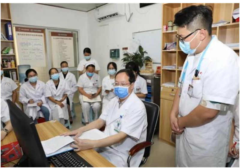 专家团队在贺州市中医医院综合楼大堂开展义诊活动。义诊现场群众热情高涨,患者们早早前来排队,现场义诊专家们为大家提供免费医疗服务,并根据患者的病情提出科学的诊疗意见,并讲解相关健康知识,使老百姓在家门口就能享受到广西名中医团队的优质诊疗服务。现场的患者络绎不绝,总计就诊人数近300人。8月25日上午,卢健棋教授深入心血管科开展教学查房、巡诊带教及疑难病例讨论等指导交流活动。参加查房学习人员除了贺州市中医医院的医务人员外,还有慕名赶来学习的近20名当地乡村卫生院医生。