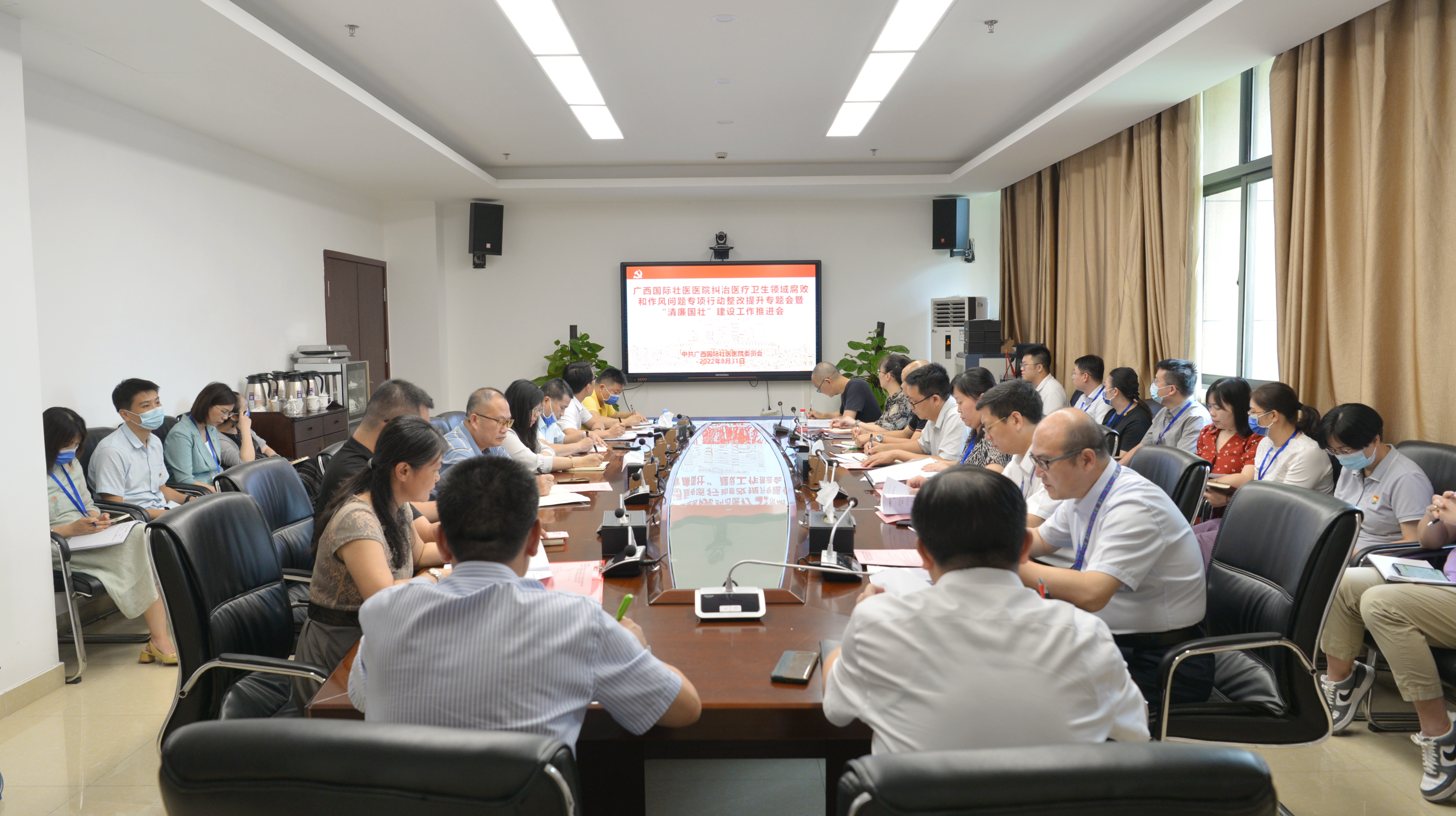 8月31日,附属国际壮医医院召开纠治医疗卫生领域腐败和作风问题专项行动整改提升专题会暨“清廉国壮”建设工作推进会,传达上级相关会议精神,总结工作阶段性进展,部署下一阶段工作任务。医院党委书记秦祖杰、院长岳桂华及医院领导班子成员,党政职能部门负责人等参会。