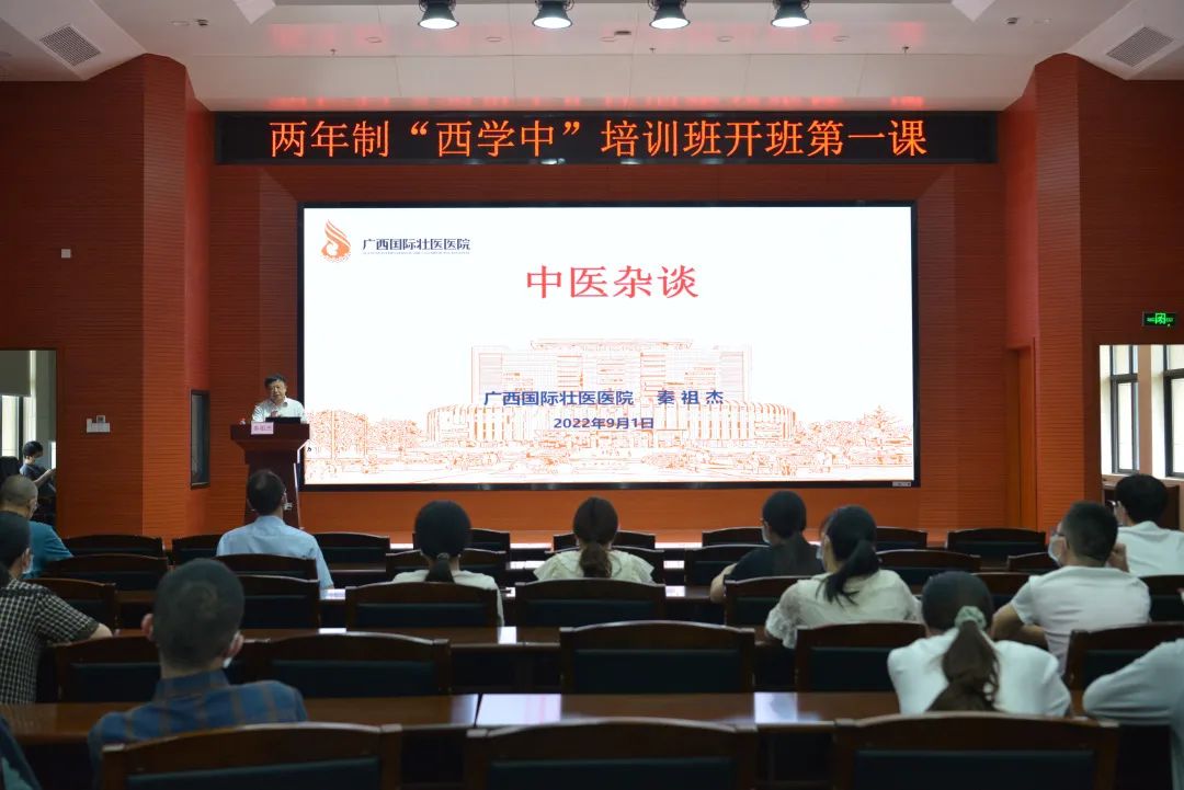 9月1日下午,附属国际壮医医院两年制“西学中”培训班开班第一课开讲,医院党委书记秦祖杰以《中医杂谈》为题为学员上了生动的一课。来自西医临床、医学检测和影像专业的30名学员参加。