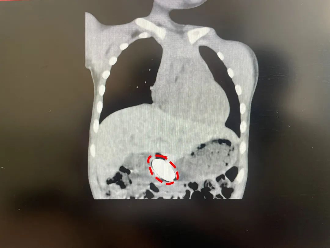 CT检查显示,患儿胃里存在一个4cm长的异物