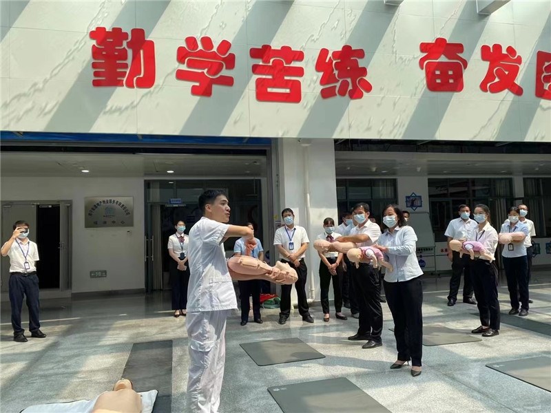 一附院受南宁轨道地产物业公司的邀请,于8月25日上午,由外联拓展部组织仙葫院区急诊科温可华与李荧妃护士,前往火车东站方向,对该公司全体的员工,开展海姆立克和心肺复苏技能的健康宣教。